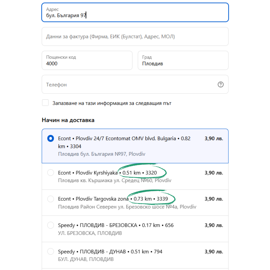 Izprati позволява показване на динамични цени и разстоянието до офиса спрямо въведения адрес директно в checkout страницата.
